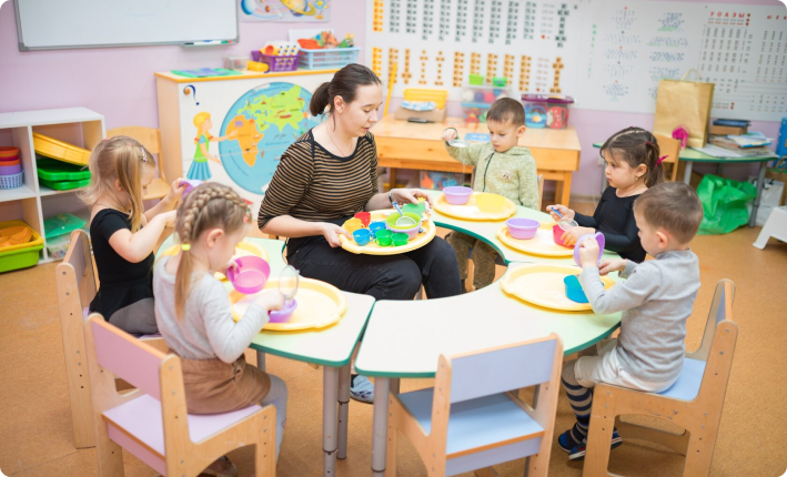 — 4 занятия в день: 2 развивающих занятия утром и 2 игровых вечером (песочная студия, этикет, эксперименты и опыты, интерактивные сказки, кукольный театр и т.д.)
